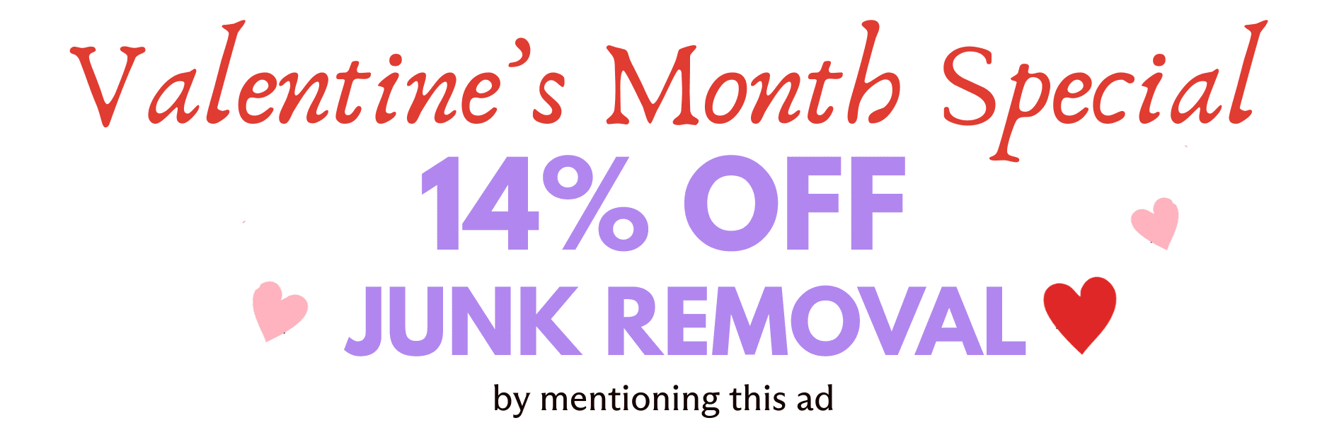 Offer valid February 1–28, 2026. Limit one 14% promotional discount per customer. Discount applies to standard junk removal services only. Customer must reference this promotion at the time of booking or during the onsite estimate to receive the discount. Additional items or special handling may result in additional charges.
