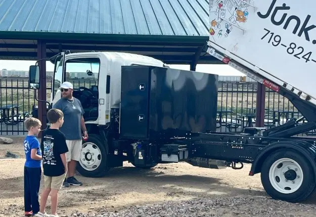 The same-day junk haulers in Colorado Springs joined the fun at the Family Worship Center for Pueblo’s 4th Annual Ridez N Rodz Car Show. Driving in with their signature Junk.com truck and passing out squishy Junk.com stress toys, the clutter-busting crew became a crowd favorite. Delighted children and their parents climbed aboard to explore and get photos.
